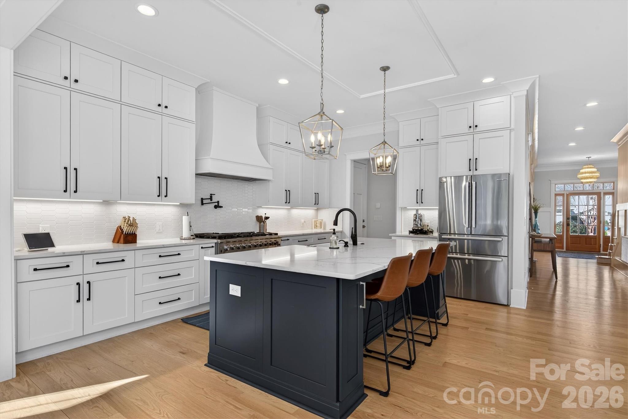 Through the heavy wood and glass front door, you are greeted by a wide foyer that immediately showcases the spaciousness, natural brightness, and uncompromising quality of this custom-built high end home. Beautiful site-finished hardwood floors flow seamlessly through every room. Enjoy the modern tech convenience of motorized shades whilst upgraded modern lighting fixtures elevate every space. The kitchen features an over size quartzite island, high-end appliances, walk-in pantry with the added bonus of a 48" range with 8 burners.
